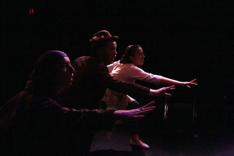 "Hood in the Wood" is a poetic retelling of the classic Red Riding Hood folktale. Little Hood aches to explore the mysterious woods around her, and when she gets a message from her sick Gran, she leaps at the opportunity. Along the way the Narrator/Ensemble of the Forest make themselves known through the flowers, trees, and shadows of the Wood. Little Hood strays from the path and finds Wolf chained, howling to be free. The two embark on their journey to Gran’s house becoming strange friends along the way.